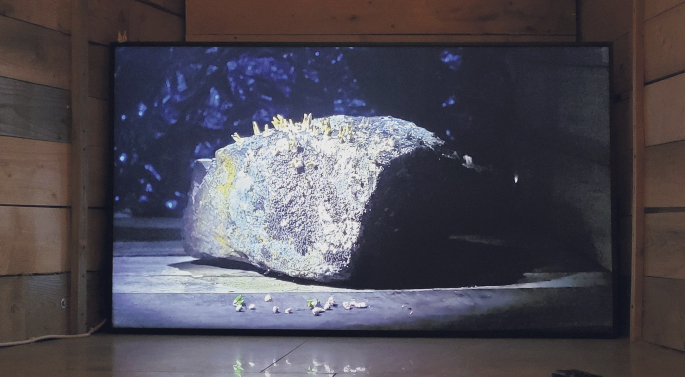 Darüber hinaus ging es um eine Auseinandersetzung mit nichts weniger als der Latenz von Stein und Mensch. Besonders die titelgebende Installation It’s still early, die im hinteren Teil des Raumes als Monitor im Holzverschlag aufgebaut wurde, verdeutlicht, was Präsenz und Latenz innerhalb dieses Konzeptes bedeutet. Der Monitor zeigt einen ruhenden Felsen, ein Screening einer grauen Entität vor schwarzem Hintergrund. Auf der (Bild-)Oberfläche sind kleine Bewegungen zu erkennen; vielleicht real, oder Bildartefakt, eventuell kleinere Bewegungsspuren menschlicher Vermessungsaktivität, sicher aber künstlerische Bearbeitung. Auf dem Begleitzettel zur Ausstellung ist zu lesen: „Die Werke dieser Ausstellungen versuchen nicht, das Phänomen dieses Steins zu erklären, sondern die Latenz einer steinernen Bewegung nachzuempfinden.“ Aber was hat es mit dem Begriff auf sich – mit der angesprochenen Latenz der Felsen? Weiteres Zitat aus dem Ausstellungstext: „Dieser Felsen (…) markiert eine Route, die von einem Dorf zum nächsten führt. Gleichzeitig trägt er auch eine lokale Kosmogonie, eine Form des Wissens über die Erschaffung der Welt in sich. Die mündliche Überlieferung lautet in etwa so: Als es Licht wurde, verwandelten sich bedeutende Charaktere jener Zeit in Felsen, um zu überleben, um abzuwarten.“