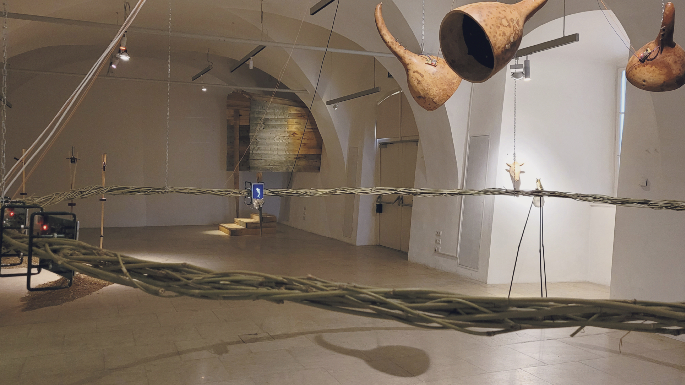 Hier treffen also grundsätzliche Konzepte von Zeit und Leben auf Kosmologien oder Interpretationen, dass diese Art der Geschichtserzählung mit dem Beginn der Kolonialherrschaft zu tun hat. Weiters geht es um weitläufige Verschiebungen eines Mess-Spektrums zwischen Physik und Bedeutung, um Sedimente, Wasservorkommen, seltene Pflanzen – wie etwa die Frailejones, ausdauernde, wollige Halbsträucher, die nur im Ökosystem der Paramos vorkommen – und damit insgesamt um tatsächliche Natur und solides Wissen darüber: Andrés erkundet dieses Gebiet seit Jahren in seiner künstlerischen Praxis. Boesl und Andrés haben sich im Vorfeld dieser Ausstellung übrigens wechselseitig nach Linz und Kolumbien eingeladen. Und sie haben die eigene Präsenz, die eigenen Erfahrungen von „feinfühligen Ansätzen“ im kargen Raum der Gletscherregion in die Ausstellung eingearbeitet. Zum Teil der Wahrnehmung wurden so auch diverse Vermessungen und Datensammlungen. Bzw. vermittelt die Installation pulling numbers at dawn eher eine Idee von Ritualen der Vermessung: Die Vermessung durch DIY-Geräte, lange Stäbe mit Distanzmesser oder Counter darauf montiert (u. a.), scheint dabei so sinnvoll oder sinnlos wie die Ritualhandlungen, die Artefakte von Tierköpfen oder anderen installativen Objekten mit dem Titel waiting vermitteln. Dieser Ansatz von Gleichwertigkeit der Systeme Wissenschaft und Ritual eröffnet jedoch größere Horizonte – eben auch jene der Wirksamkeit größerer Latenzen, die noch unentdeckt oder noch unverwirklicht den Dingen innewohnen.